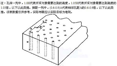2、設計破碎方案:布眼前首先要確定至少有一個以上自由面(臨空面),鉆孔方向應盡可能做到與自由面平行;切割巖石或混凝土時同一排鉆孔應盡可能保持在一個平面上。自由面越多,單位破石量就越大,經濟效益也更高。破碎方案確定后,首先使用鉆機鉆孔。關于孔徑、孔距、孔深和破碎設計,應根據被破碎物的具體情況而定。如:混凝土結構:有無鋼筋、鋼筋直徑、排列情況;巖石結構:性態、節理、被破碎物的大小等??拙嗯c排距(抵抗線距離)布置:孔距與排距的大小與巖石硬度、混凝土強度及布筋有直接關系,硬度越大、混凝土強度越高、布筋密鋼筋粗時,孔距與排距越小,反之則大,孔距與排距布置,根據施工經驗提出以下鉆孔數據以供參考: